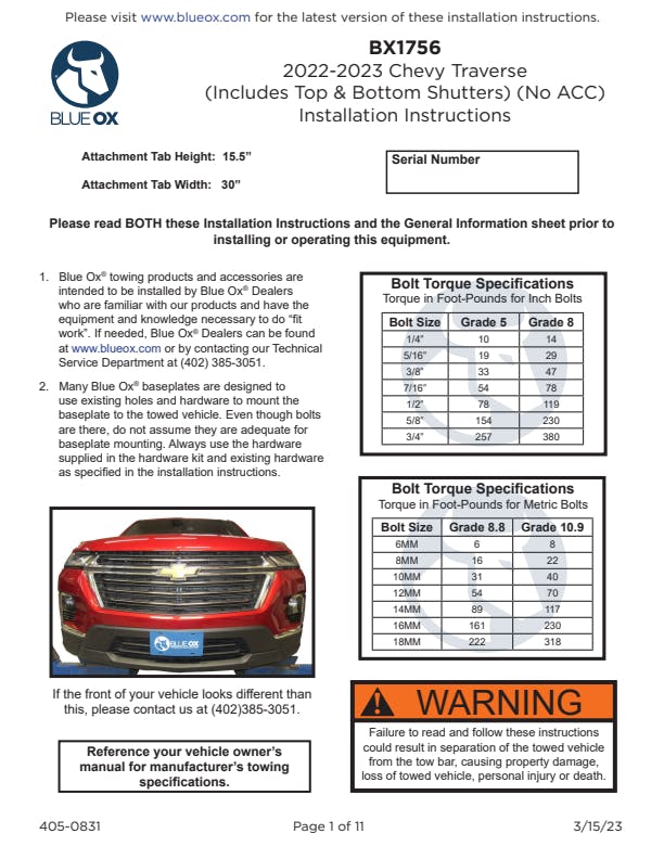 Please read BOTH these Installation Instructions and the General Information sheet prior to installing or operating this equipment. Blue Ox® towing products and accessories are intended to be installed by Blue Ox® Dealers who are familiar with our products and have the equipment and knowledge necessary to do “fit work”. Many Blue Ox® baseplates are designed to use existing holes and hardware to mount the baseplate to the towed vehicle. Even though bolts are there, do not assume they are adequate for baseplate mounting. Always use the hardware supplied in the hardware kit and existing hardware as specified in the installation instructions.