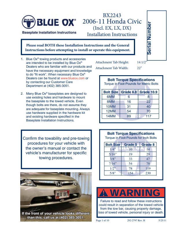 Please read BOTH these Installation Instructions and the General Information sheet prior to installing or operating this equipment. Blue Ox® towing products and accessories are intended to be installed by Blue Ox® Dealers who are familiar with our products and have the equipment and knowledge necessary to do “fit work”. Many Blue Ox® baseplates are designed to use existing holes and hardware to mount the baseplate to the towed vehicle. Even though bolts are there, do not assume they are adequate for baseplate mounting. Always use the hardware supplied in the hardware kit and existing hardware as specified in the installation instructions.