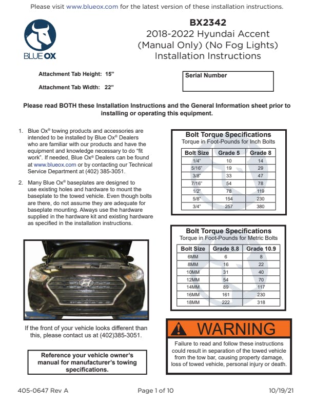 Please read BOTH these Installation Instructions and the General Information sheet prior to installing or operating this equipment. Blue Ox® towing products and accessories are intended to be installed by Blue Ox® Dealers who are familiar with our products and have the equipment and knowledge necessary to do “fit work”. Many Blue Ox® baseplates are designed to use existing holes and hardware to mount the baseplate to the towed vehicle. Even though bolts are there, do not assume they are adequate for baseplate mounting. Always use the hardware supplied in the hardware kit and existing hardware as specified in the installation instructions.