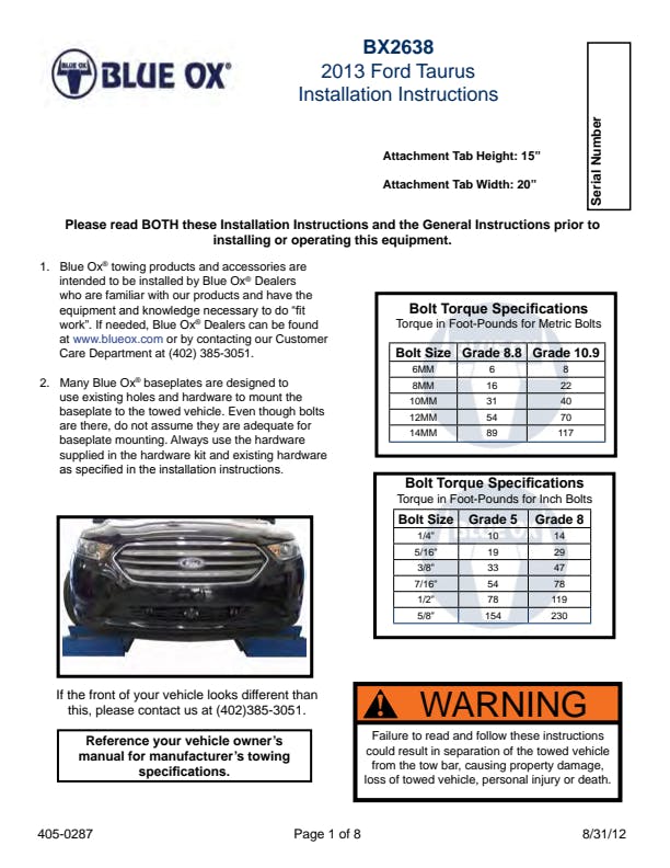 Please read BOTH these Installation Instructions and the General Information sheet prior to installing or operating this equipment. Blue Ox® towing products and accessories are intended to be installed by Blue Ox® Dealers who are familiar with our products and have the equipment and knowledge necessary to do “fit work”. Many Blue Ox® baseplates are designed to use existing holes and hardware to mount the baseplate to the towed vehicle. Even though bolts are there, do not assume they are adequate for baseplate mounting. Always use the hardware supplied in the hardware kit and existing hardware as specified in the installation instructions.
