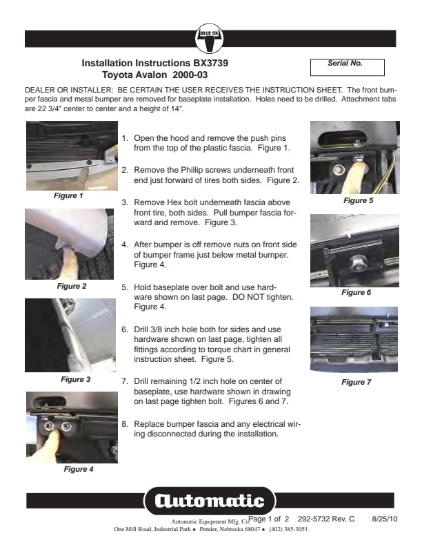 Please read BOTH these Installation Instructions and the General Information sheet prior to installing or operating this equipment. Blue Ox® towing products and accessories are intended to be installed by Blue Ox® Dealers who are familiar with our products and have the equipment and knowledge necessary to do “fit work”. Many Blue Ox® baseplates are designed to use existing holes and hardware to mount the baseplate to the towed vehicle. Even though bolts are there, do not assume they are adequate for baseplate mounting. Always use the hardware supplied in the hardware kit and existing hardware as specified in the installation instructions.