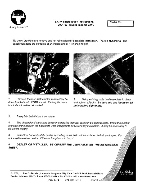 Please read BOTH these Installation Instructions and the General Information sheet prior to installing or operating this equipment. Blue Ox® towing products and accessories are intended to be installed by Blue Ox® Dealers who are familiar with our products and have the equipment and knowledge necessary to do “fit work”. Many Blue Ox® baseplates are designed to use existing holes and hardware to mount the baseplate to the towed vehicle. Even though bolts are there, do not assume they are adequate for baseplate mounting. Always use the hardware supplied in the hardware kit and existing hardware as specified in the installation instructions.