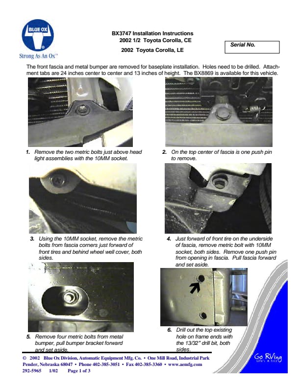 Please read BOTH these Installation Instructions and the General Information sheet prior to installing or operating this equipment. Blue Ox® towing products and accessories are intended to be installed by Blue Ox® Dealers who are familiar with our products and have the equipment and knowledge necessary to do “fit work”. Many Blue Ox® baseplates are designed to use existing holes and hardware to mount the baseplate to the towed vehicle. Even though bolts are there, do not assume they are adequate for baseplate mounting. Always use the hardware supplied in the hardware kit and existing hardware as specified in the installation instructions.