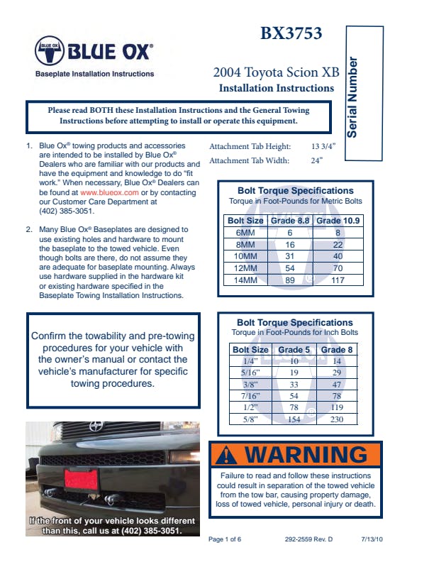 Please read BOTH these Installation Instructions and the General Information sheet prior to installing or operating this equipment. Blue Ox® towing products and accessories are intended to be installed by Blue Ox® Dealers who are familiar with our products and have the equipment and knowledge necessary to do “fit work”. Many Blue Ox® baseplates are designed to use existing holes and hardware to mount the baseplate to the towed vehicle. Even though bolts are there, do not assume they are adequate for baseplate mounting. Always use the hardware supplied in the hardware kit and existing hardware as specified in the installation instructions.