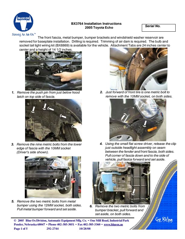 Please read BOTH these Installation Instructions and the General Information sheet prior to installing or operating this equipment. Blue Ox® towing products and accessories are intended to be installed by Blue Ox® Dealers who are familiar with our products and have the equipment and knowledge necessary to do “fit work”. Many Blue Ox® baseplates are designed to use existing holes and hardware to mount the baseplate to the towed vehicle. Even though bolts are there, do not assume they are adequate for baseplate mounting. Always use the hardware supplied in the hardware kit and existing hardware as specified in the installation instructions.