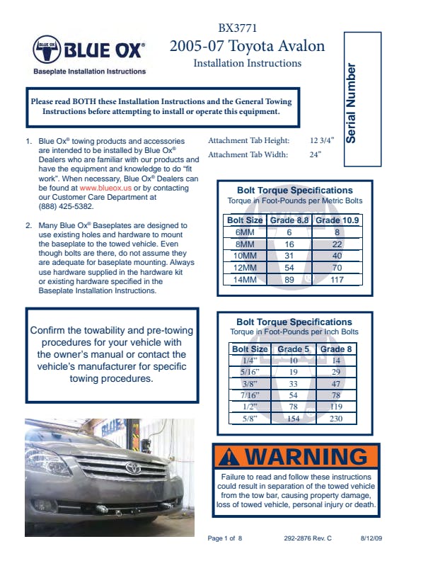 Please read BOTH these Installation Instructions and the General Information sheet prior to installing or operating this equipment. Blue Ox® towing products and accessories are intended to be installed by Blue Ox® Dealers who are familiar with our products and have the equipment and knowledge necessary to do “fit work”. Many Blue Ox® baseplates are designed to use existing holes and hardware to mount the baseplate to the towed vehicle. Even though bolts are there, do not assume they are adequate for baseplate mounting. Always use the hardware supplied in the hardware kit and existing hardware as specified in the installation instructions.