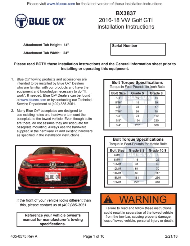 Please read BOTH these Installation Instructions and the General Information sheet prior to installing or operating this equipment. Blue Ox® towing products and accessories are intended to be installed by Blue Ox® Dealers who are familiar with our products and have the equipment and knowledge necessary to do “fit work”. Many Blue Ox® baseplates are designed to use existing holes and hardware to mount the baseplate to the towed vehicle. Even though bolts are there, do not assume they are adequate for baseplate mounting. Always use the hardware supplied in the hardware kit and existing hardware as specified in the installation instructions.