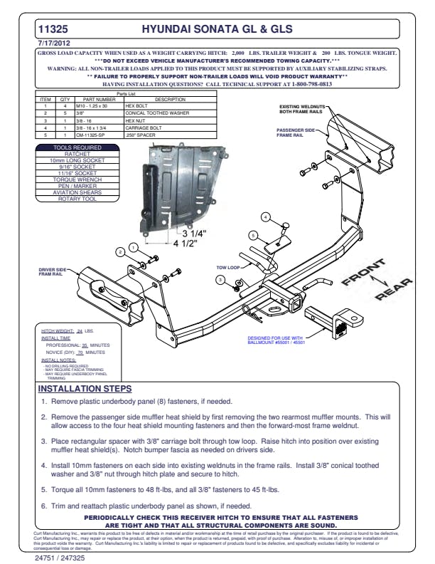 However you define adventure -- whether it's climbing onto the back of a mountain bike, hunting from the top of a tree stand or camping with the family a long way from nowhere -- CURT class 1 hitches provide a light-duty towing receiver to help you Bring It. Each is made to fit a specific vehicle, providing easier installation, a better fit and optimal towing capacity. Custom class 1 trailer hitches are available for a variety of smaller vehicle types, including the compact car, crossover, minivan and small SUV. This particular class 1 hitch is designed to be a custom hitch for certain years of the Hyundai Sonata (to verify vehicle compatibility, see the CURT application guide at curtmfg.com). Tested in accordance with SAE J684, it offers a weight carrying capacity of 2,000 lbs. GTW and 200 lbs. TW. It is equipped with 1-1/4 receiver tube opening to accept a ball mount shank or other hitch mount. This class 1 hitch also comes with all necessary mounting hardware. With its lightweight design and smaller receiver tube size, a class 1 hitch is especially useful for adding cargo space with a hitch-mounted bike rack or cargo carrier. They can also typically be used to tow small trailers such as a utility trailer, kayak trailer or teardrop camper (never exceed the lowest weight capacity of any towing component; i.e. the vehicle, hitch, trailer, etc). Though CURT class 1 trailer hitches are only intended for light-duty towing, we apply the same principles of quality as we do to the rest of our rear mount hitches. Each class 1 hitch is made with hands-on engineering, high-strength steel and precise welding. We use a co-cured finish of liquid A-coat, inside and out, and durable black powder coat to provide a lasting defense against rust, chips and UV rays.