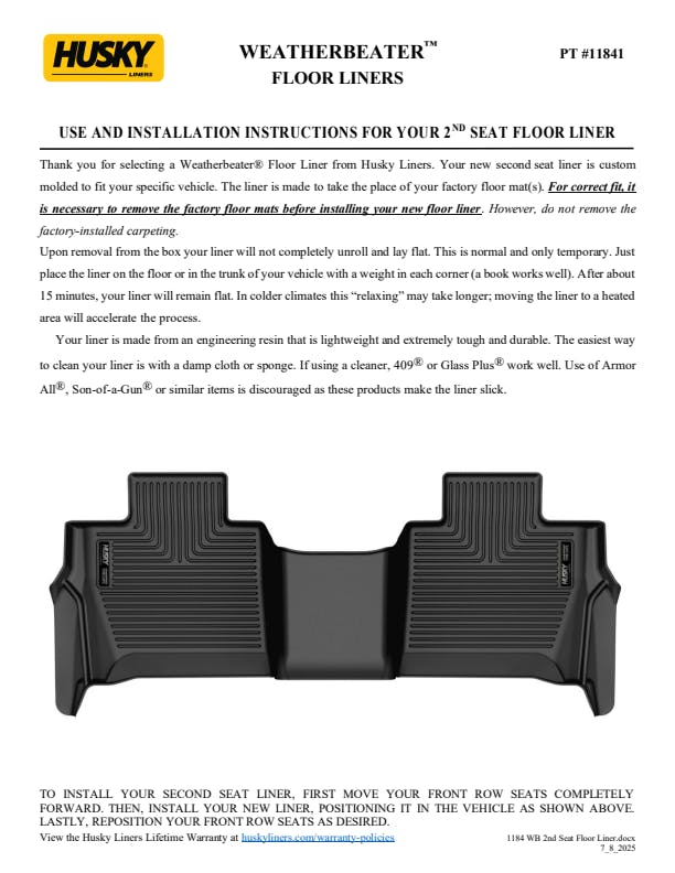 - WeatherBeater(TM) Liners offer protection that extends all the way to your rear seats. So go ahead, lift the seats and leave them up, load after load. Husky's got your floors, and your back, no matter what the road brings your way.