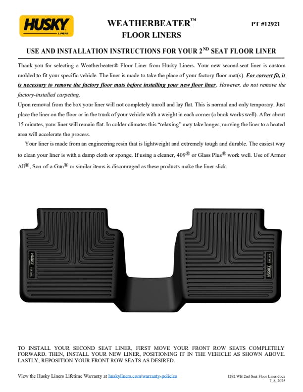 - WeatherBeater(TM) Liners offer protection that extends all the way to your rear seats. So go ahead, lift the seats and leave them up, load after load. Husky's got your floors, and your back, no matter what the road brings your way.