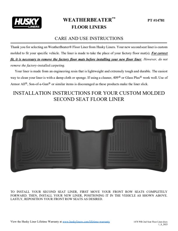 - WeatherBeater(TM) Liners offer protection that extends all the way to your rear seats. So go ahead, lift the seats and leave them up, load after load. Husky's got your floors, and your back, no matter what the road brings your way.