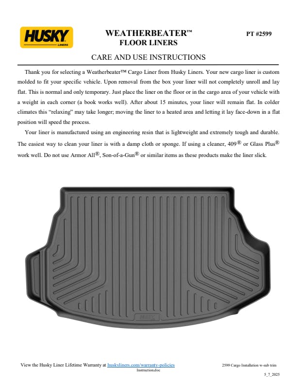 Cargo Liners are made from Husky Liners Weatherbeater material which is sporty and rugged. |