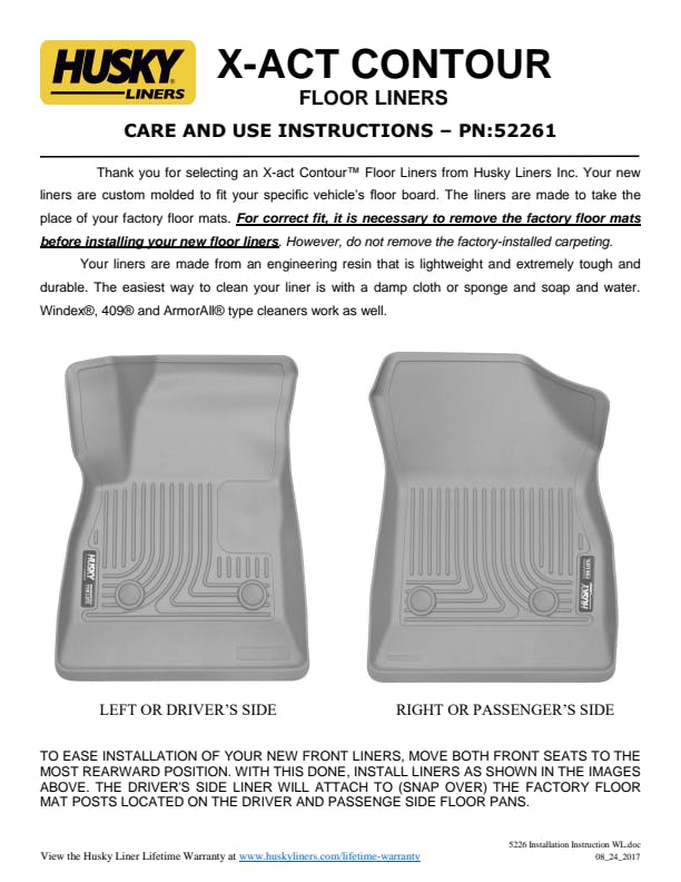 Nothing fits your vehicle better or protects longer than Husky X-act Contour?. These liners combine laser-scanned, exact fit with a no-slip, DuraGrip? surface and a softer feel. Plus, the rock-solid stability delivered by your vehicle?s factory retention posts, and our StayPut? Nibs for a no-slip, no-slide, surface with absolutely zero compromise in protection. They?re built to stand up to whatever you?re laying down? including chemicals like battery acid and oil, with our FormFit Edge? to keep whatever spills contained for easy cleanup. Available in black. Built for a lifetime of rugged abuse, warrantees the same.
