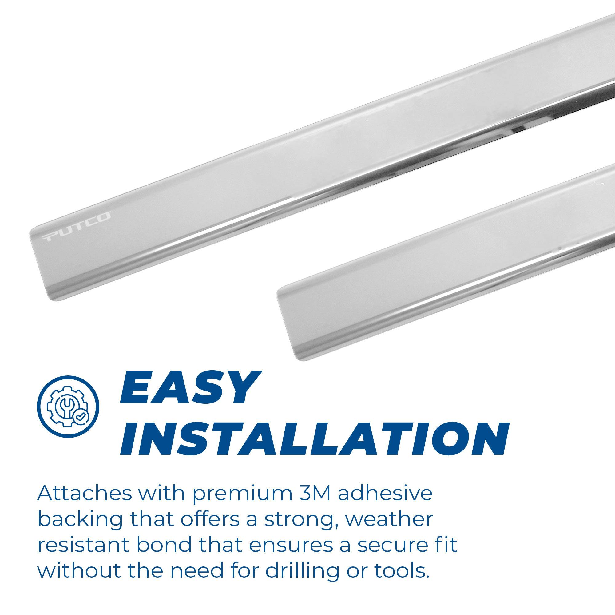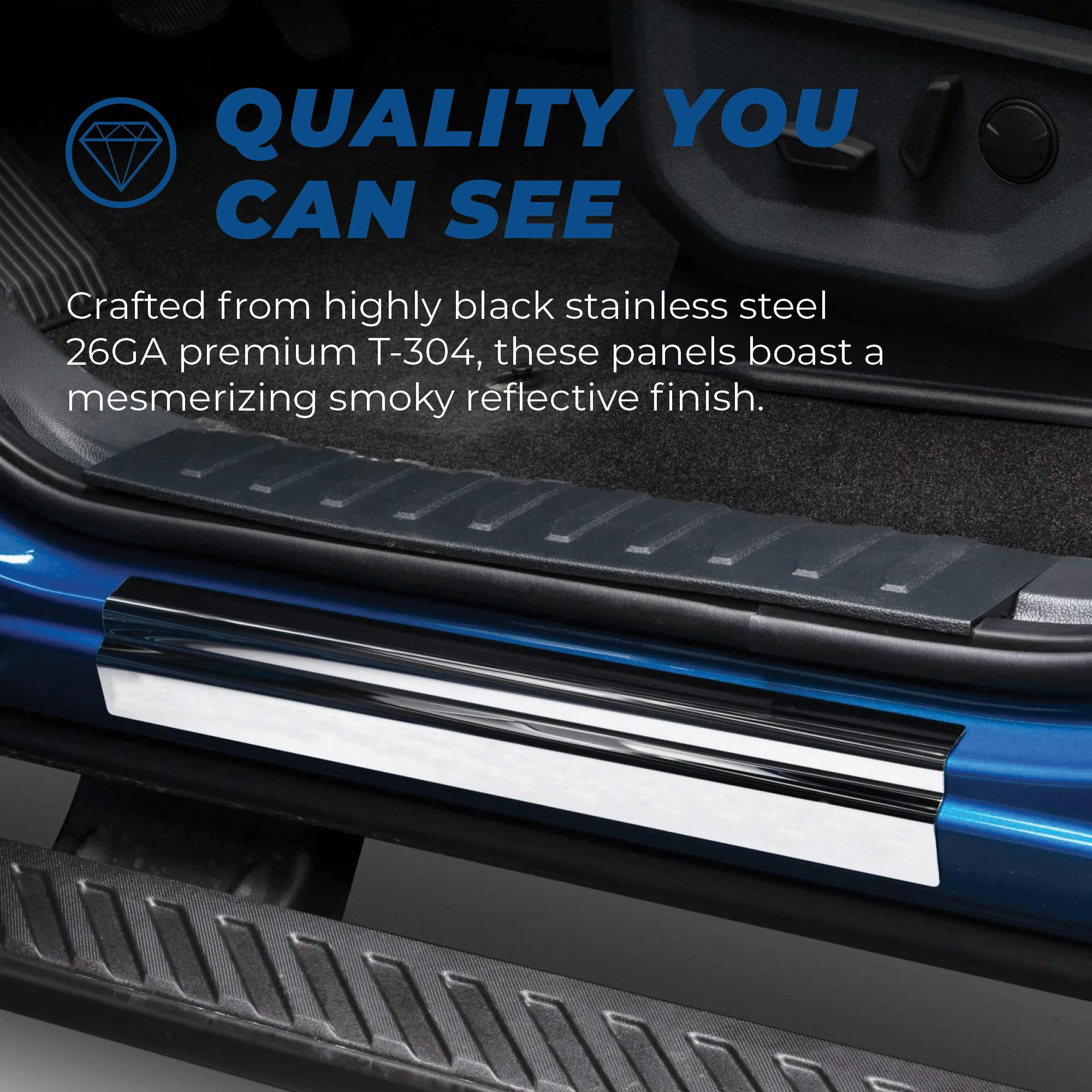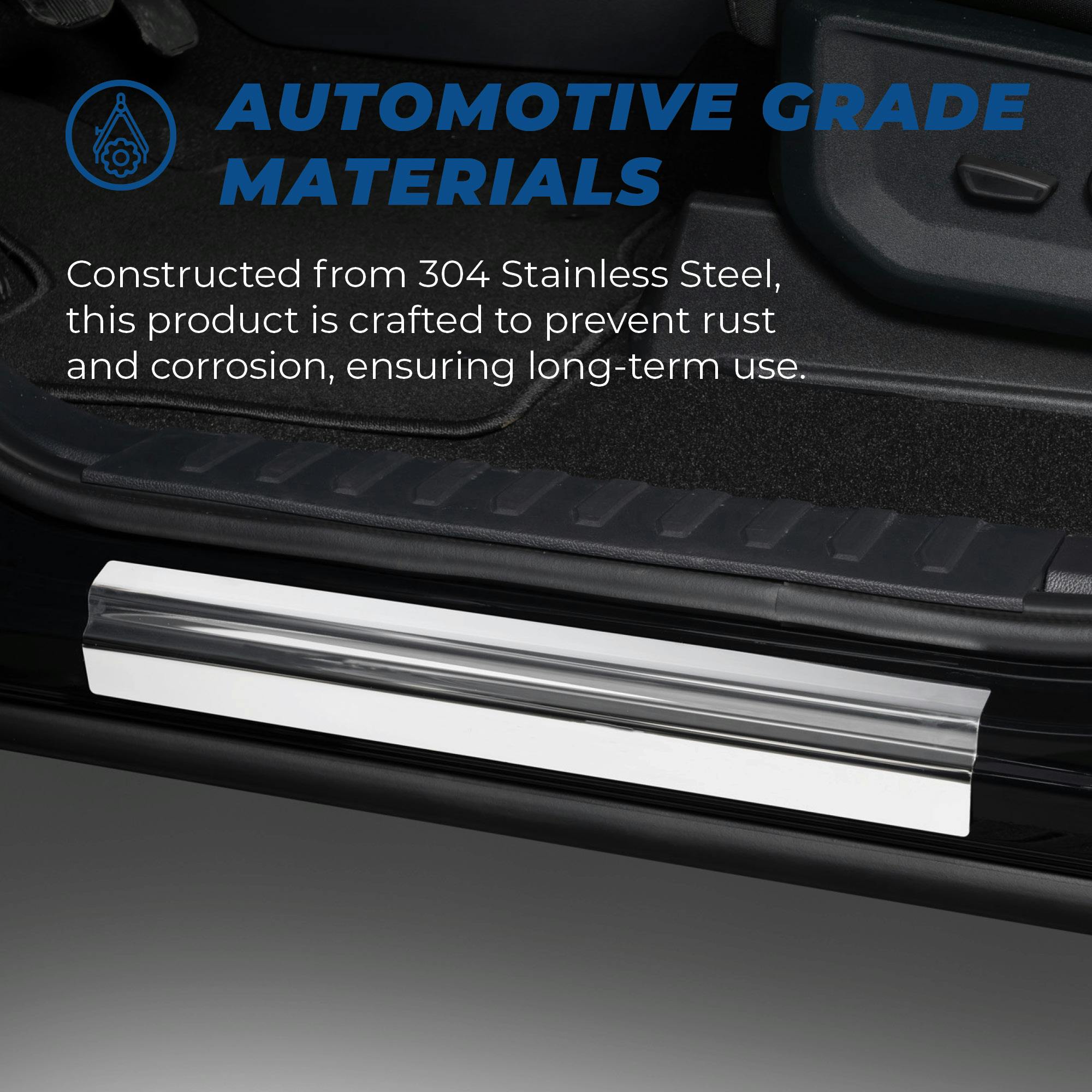 Enhance your Ford's appearance with a touch of premium elegance using these Officially Licensed Door sills. These meticulously crafted door sill trim plates are constructed from high-quality polished T-304 stainless steel, delivering a stunning mirror-like finish that adds a luxurious touch to your vehicle.Featuring Laser-etched logos like Super Duty, Ranger, F-150, Maverick, or Bronco, Custom-crafted to flawlessly fits your Ford, these door sills seamlessly integrate, giving your vehicle the high-end, expensive appearance that it deserves.The Installation is a breeze, thanks to the pre-applied automotive-grade 3M tape. Simply peel, align, and stick! Since each product is designed and manufactured in the USA, they are backed by the NeveRust limited lifetime warranty, guaranteeing exceptional durability and long-lasting performance.Protect your Ford's door sill from potential damage while enhancing its overall aesthetic appeal by adding a touch of refinement that your Ford deserves!
