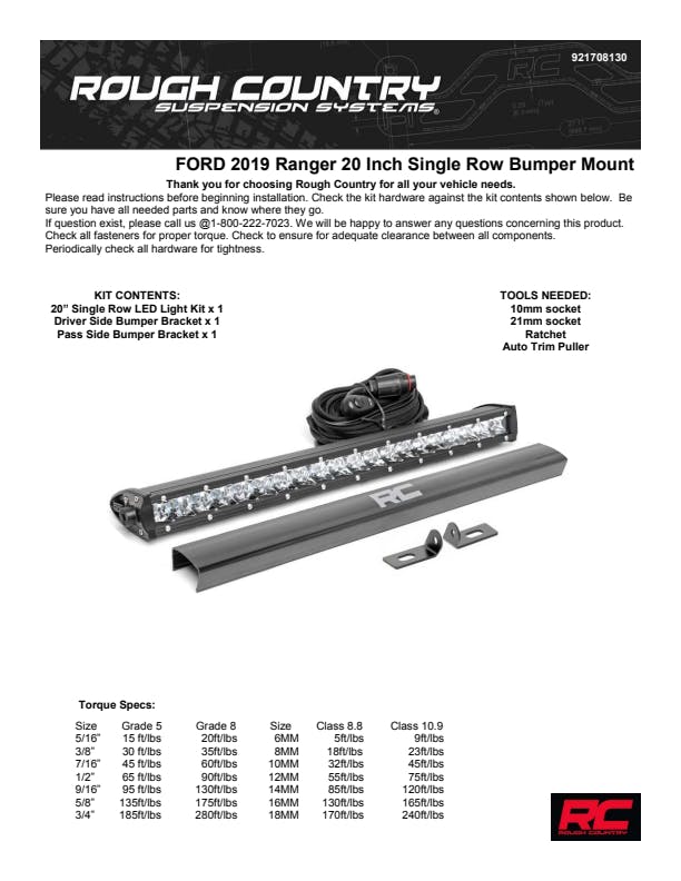Add LED lighting to your Ford Ranger quickly and easily with Rough Country's 20inBumper LED Kit! This easy-to-install solution lets you mount a 20in Rough Country Single-Row LED Light Bar in the opening on the front bumper. COMMAND THE DARK with this convenient, forward-facing lighting product that makes it easy to see the trail ahead, with powerful LED illumination provided by Rough Country's 20in Single-Row LED Light Bar. Each kit includes your choice of Rough Country's Chrome-Series or Black-Series Light Bars for the exact look you desire. Best of all, this kit is easy to install - with no cutting or drilling required - making it easy to upgrade the front-end of your Ranger with this impressive lighting system. Includes a 3-year warranty!