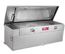 Each tank comes with gas cap, drain fittings, manual sight gauge, fuel filler shroud, along with internal baffles to reduce sloshing. Toolboxes come with linked stainless steel locks that also secure the fuel fill to prevent tampering, and two lift cylinders to hold open the crowned lid. All tanks Meet DOT standards.