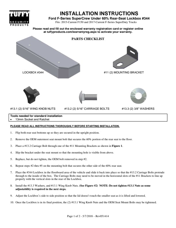 This high security welded steel security lockbox mounts under the rear 60 percent bench seat in your 2015-2024 Ford F-150 or 2017-2024 Ford F-250/F-350/F-450 Super Duty SuperCrew truck. The three-fifths width formfitting design of the Tuffy lockbox has over 3800 cubic inches of lockable storage while leaving room for an aftermarket sub-woofer or other gear under the rear passenger side seat. Its secured contents are easily accessed by flipping the 60 percent rear bench seat up and lifting the lid. The unique design allows the space beneath the 60 percent bench seat to be used to stow firearms or other long items securely. This lock box comes with Tuffy's Pry-Guard Locking System and three-digit combination security locks with built in weather seals. Chamfered corners are incorporated into the design for easier passenger access and a more concealed form factor. The innovative mounting system is accessed from inside the box.