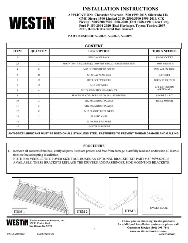 Westin 57-8095 Headache Rack Tool Box Bracket H-Rack Oversized Box Bracket |