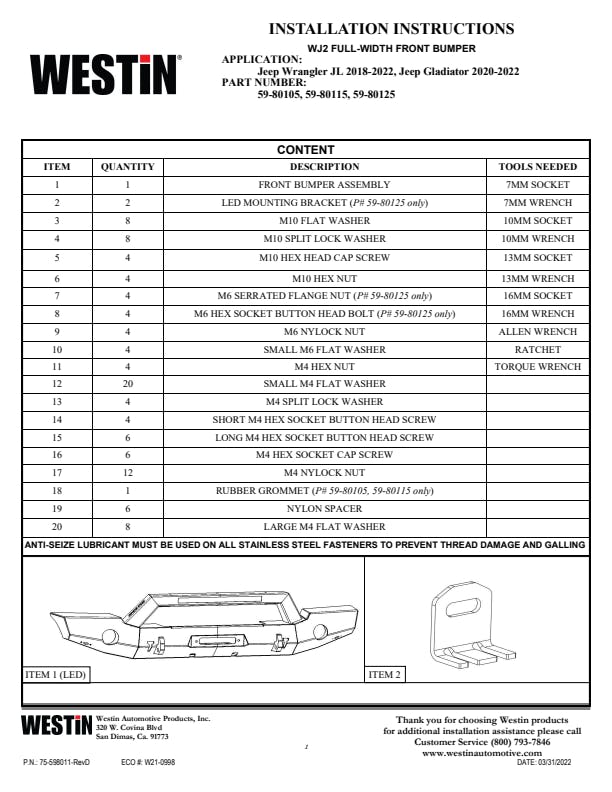 Westins WJ2 Full Width Front Bumper is constructed with 3/16-inch plate steel. With Westins new WJ2 Full Width Bumper, your winch fits inside the bumper to allow maximum air flow to your vehicles radiator and is designed to allow winch installation with your bumper already installed -- most other brands wont! It is designed to utilize both styles of factory fog lights or round post lights. Features Rock Light mount points on lower bumper corners, holes to hide light harness wires, and 2 front off-road jack points. Product offers recovery hooks with a recovery shackle mount point to allow easy tow strap attachment. Includes bumper, mounting hardware and install instructions.