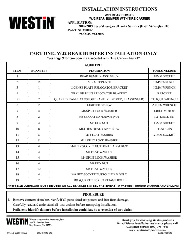 Westin's WJ2 Rear Bumper with Sensors is constructed with 3/16-inch plate steel. This clean, stylish bumper is designed to work with factory or Westin hitches and features a bottom frame mount that prevents the bumper from rotating. Our WJ2 Rear Bumper includes integrated recovery shackle mount points as well as additional mount points for Auxiliary Lights and Rock Lights. Includes 2 off-road jack points and provisions for back-up sensors. Product includes bumper, mounting hardware and install instructions.